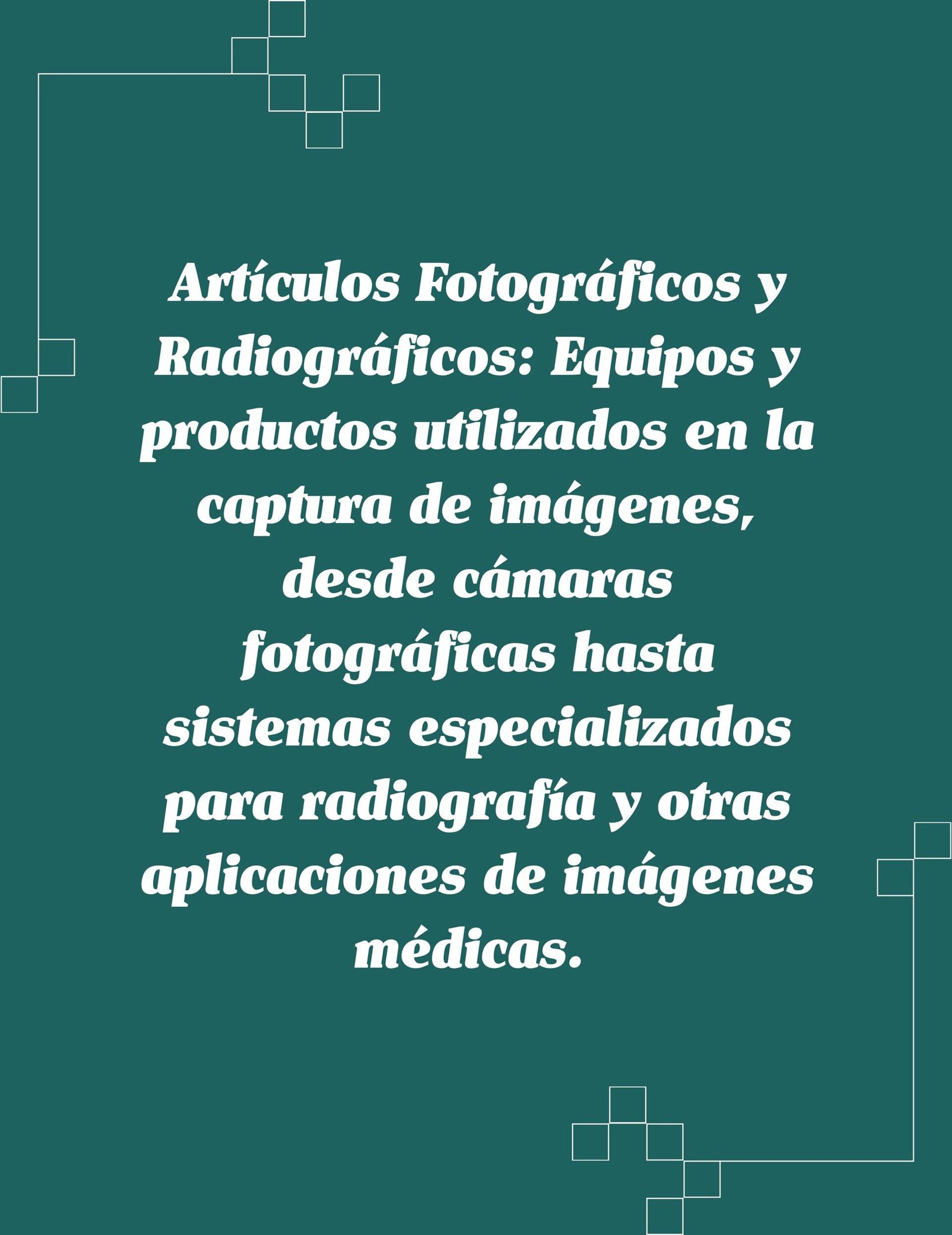 Artículos Fotográficos y Radiográficos: Equipos y productos utilizados en la captura de imágenes, desde cámaras fotográficas hasta sistemas especializados para radiografía y otras aplicaciones de imágenes médicas.