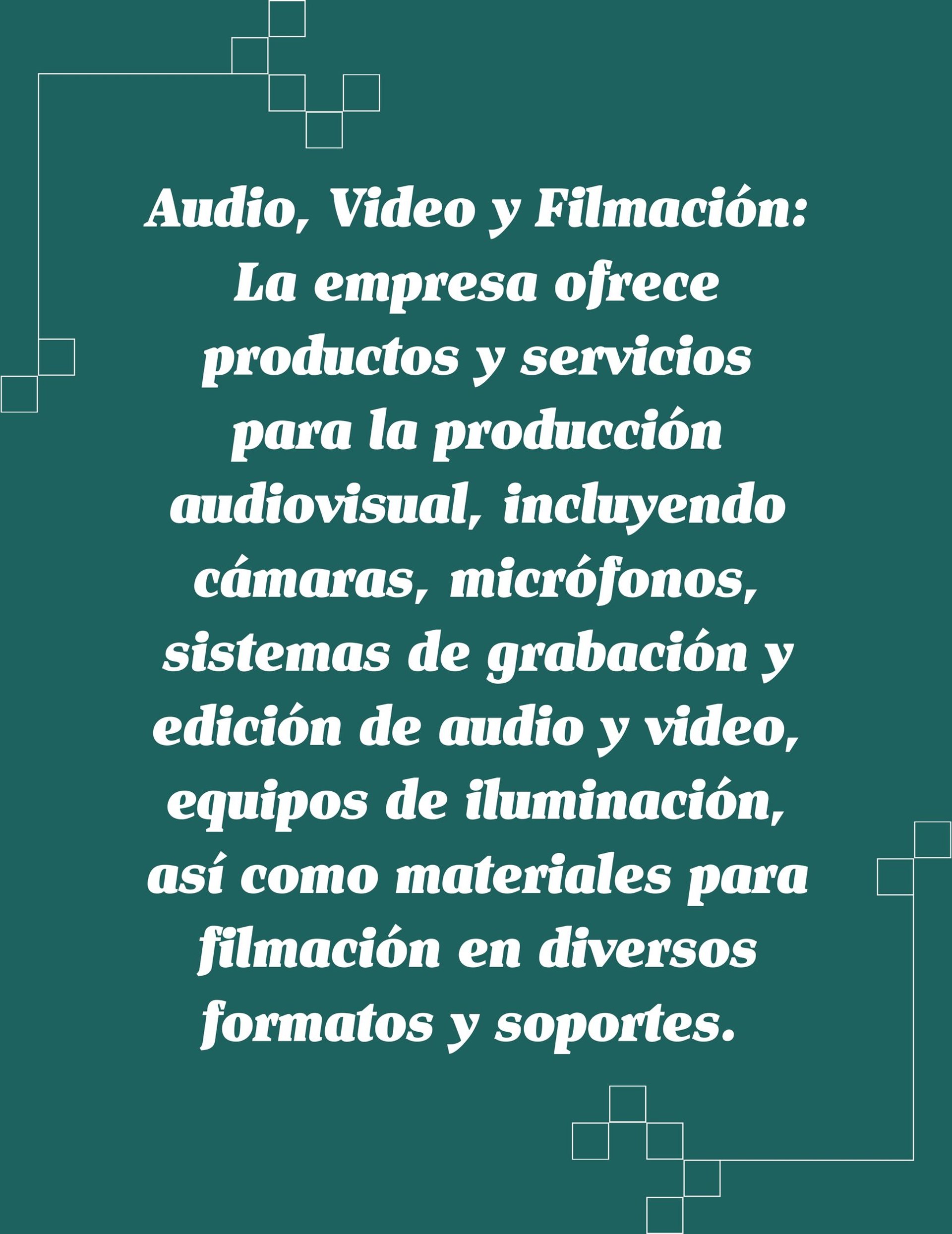 Audio, Video y Filmación: La empresa ofrece productos y servicios para la producción audiovisual, incluyendo cámaras, micrófonos, sistemas de grabación y edición de audio y video, equipos de iluminación, así como materiales para filmación en diversos formatos y soportes.