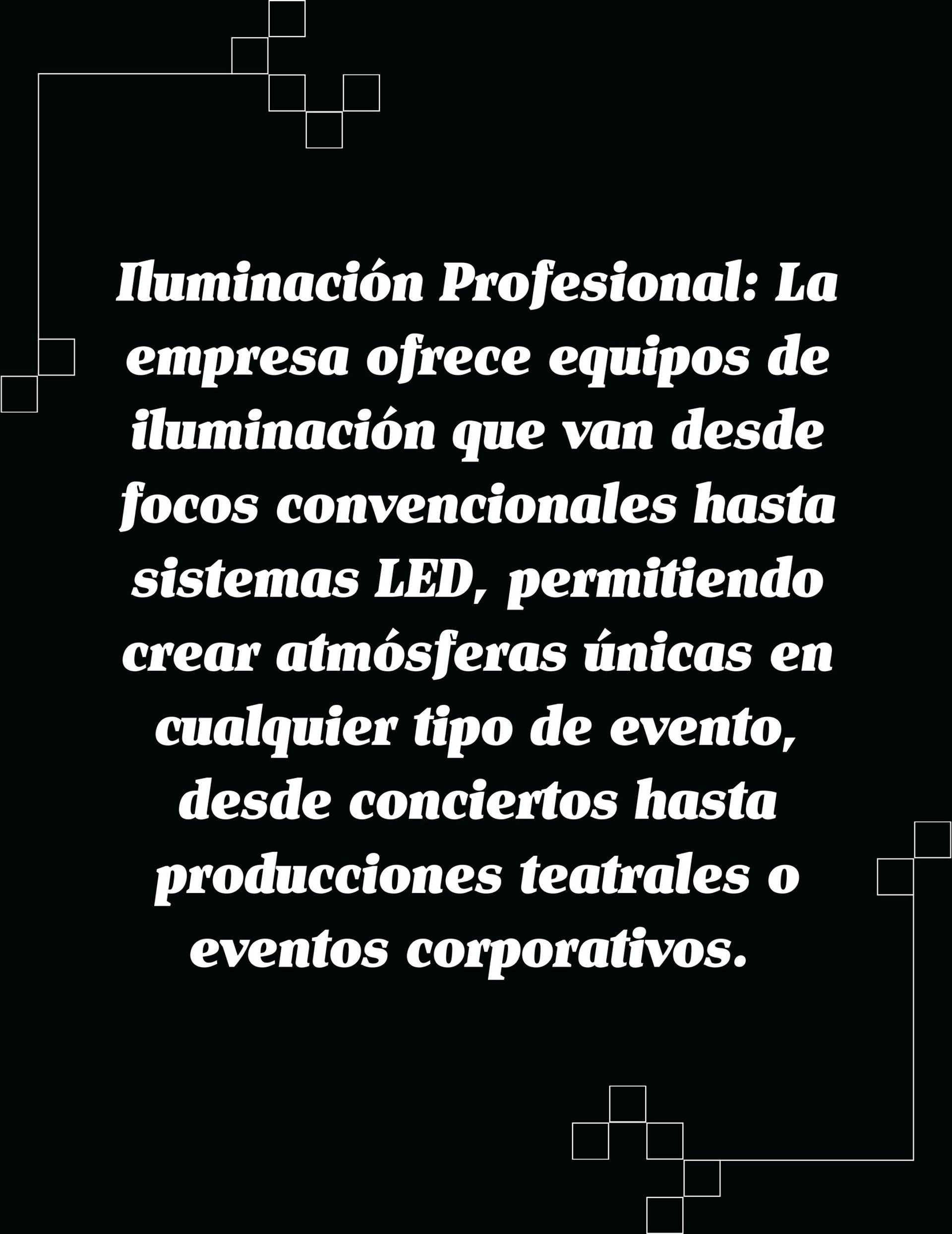 Iluminación Profesional: La empresa ofrece equipos de iluminación que van desde focos convencionales hasta sistemas LED, permitiendo crear atmósferas únicas en cualquier tipo de evento, desde conciertos hasta producciones teatrales o eventos corporativos.