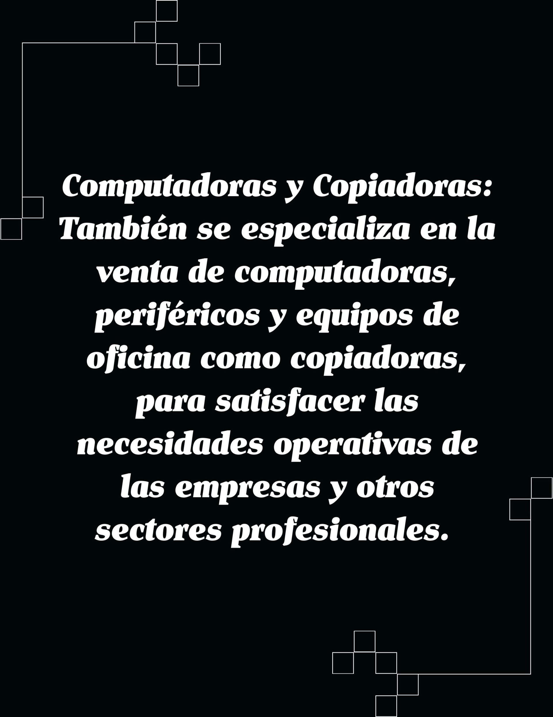 Computadoras y Copiadoras: También se especializa en la venta de computadoras, periféricos y equipos de oficina como copiadoras, para satisfacer las necesidades operativas de las empresas y otros sectores profesionales.