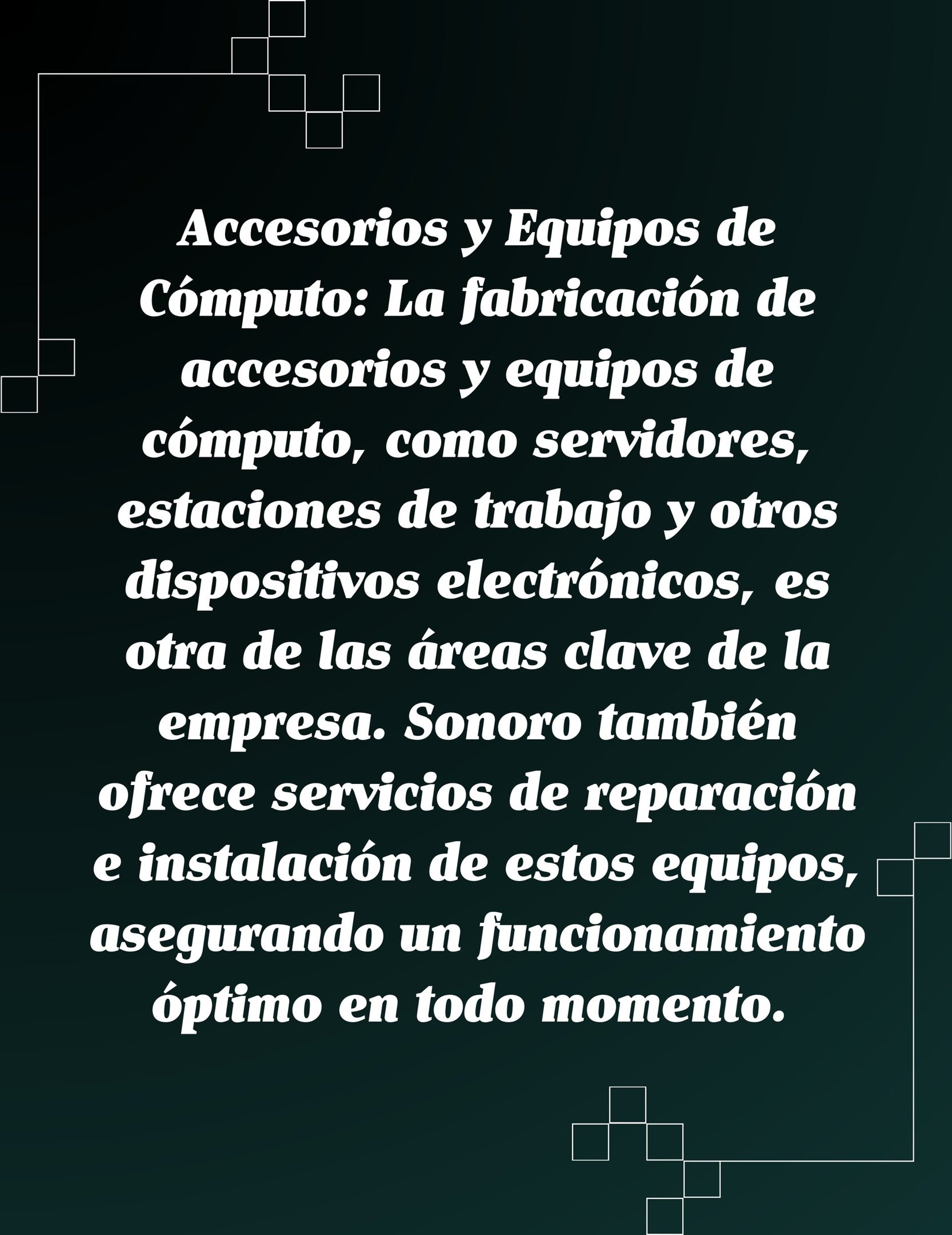 Accesorios y Equipos de Cómputo: La fabricación de accesorios y equipos de cómputo, como servidores, estaciones de trabajo y otros dispositivos electrónicos, es otra de las áreas clave de la empresa. Sonoro también ofrece servicios de reparación e instalación de estos equipos, asegurando un funcionamiento óptimo en todo momento.