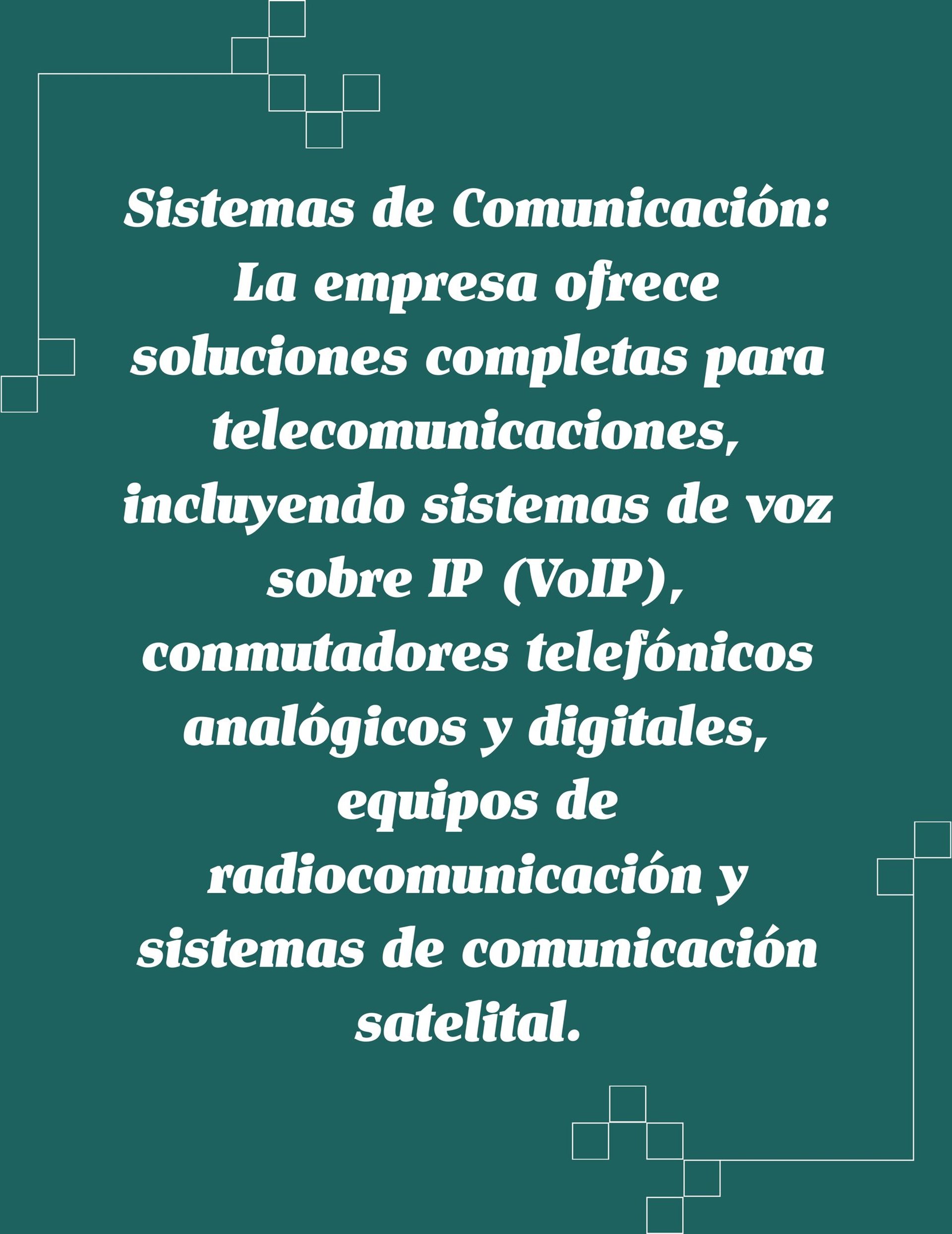 Sistemas de Comunicación: La empresa ofrece soluciones completas para telecomunicaciones, incluyendo sistemas de voz sobre IP (VoIP), conmutadores telefónicos analógicos y digitales, equipos de radiocomunicación y sistemas de comunicación satelital.