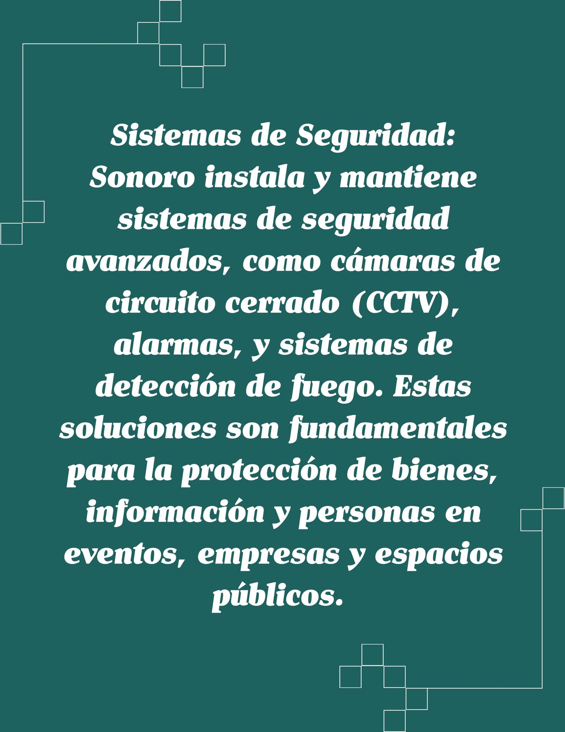 Sistemas de Seguridad: Sonoro instala y mantiene sistemas de seguridad avanzados, como cámaras de circuito cerrado (CCTV), alarmas, y sistemas de detección de fuego. Estas soluciones son fundamentales para la protección de bienes, información y personas en eventos, empresas y espacios públicos.