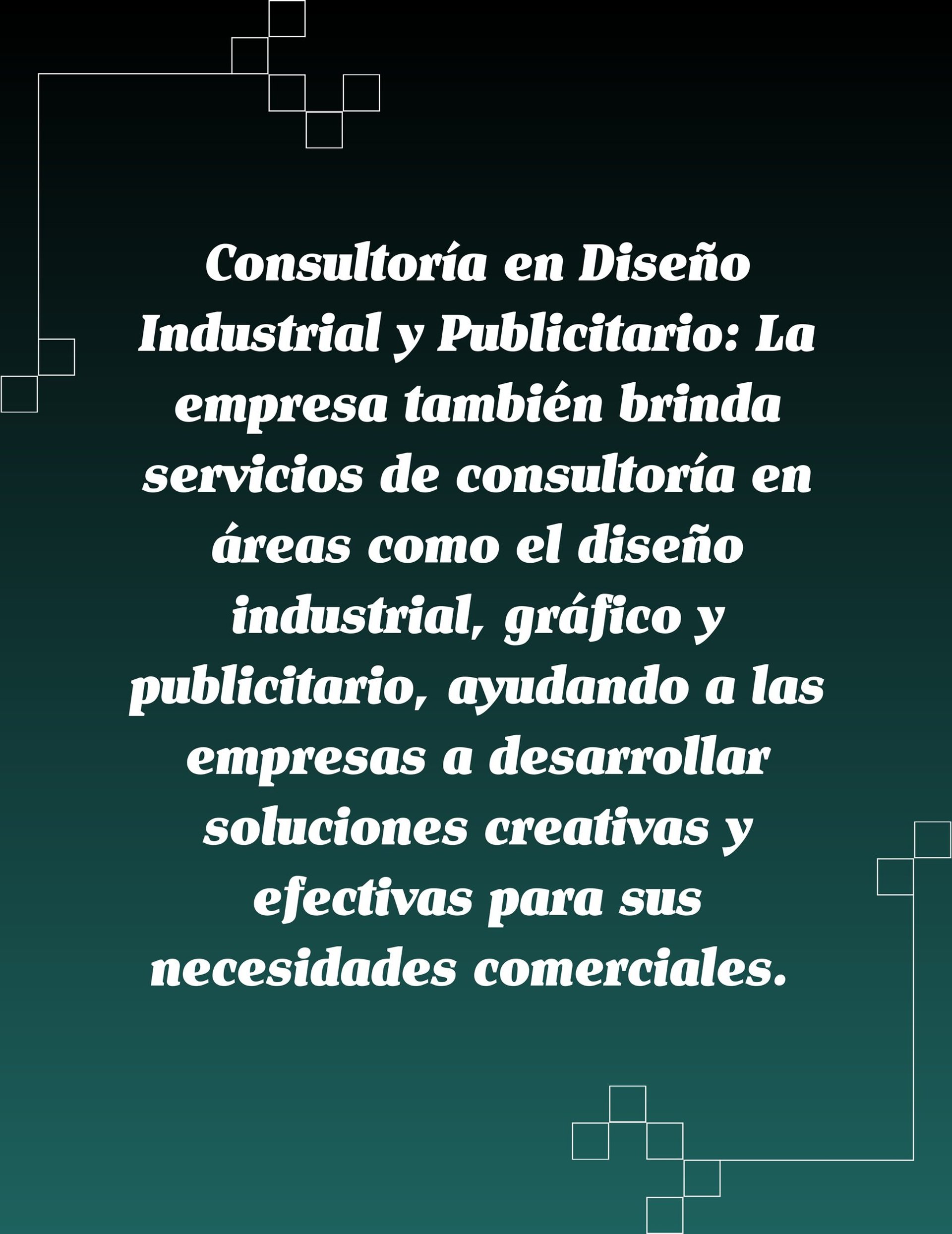 Consultoría en Diseño Industrial y Publicitario: La empresa también brinda servicios de consultoría en áreas como el diseño industrial, gráfico y publicitario, ayudando a las empresas a desarrollar soluciones creativas y efectivas para sus necesidades comerciales.