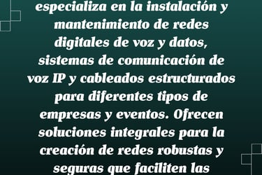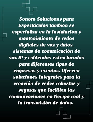 Sonoro Soluciones para Espectáculos también se especializa en la instalación y mantenimiento de redes digitales de voz y datos, sistemas de comunicación de voz IP y cableados estructurados para diferentes tipos de empresas y eventos. Ofrecen soluciones integrales para la creación de redes robustas y seguras que faciliten las comunicaciones en tiempo real y la transmisión de datos.