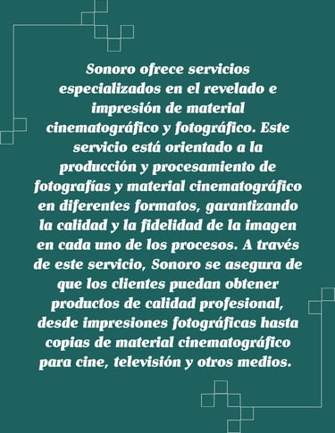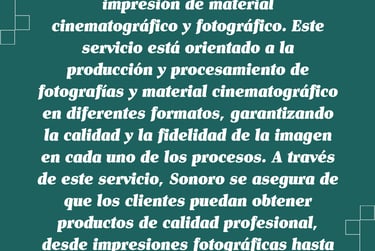 Sonoro ofrece servicios especializados en el revelado e impresión de material cinematográfico y fotográfico. Este servicio está orientado a la producción y procesamiento de fotografías y material cinematográfico en diferentes formatos, garantizando la calidad y la fidelidad de la imagen en cada uno de los procesos. A través de este servicio, Sonoro se asegura de que los clientes puedan obtener productos de calidad profesional, desde impresiones fotográficas hasta copias de material cinematográfico para cine, televisión y otros medios.